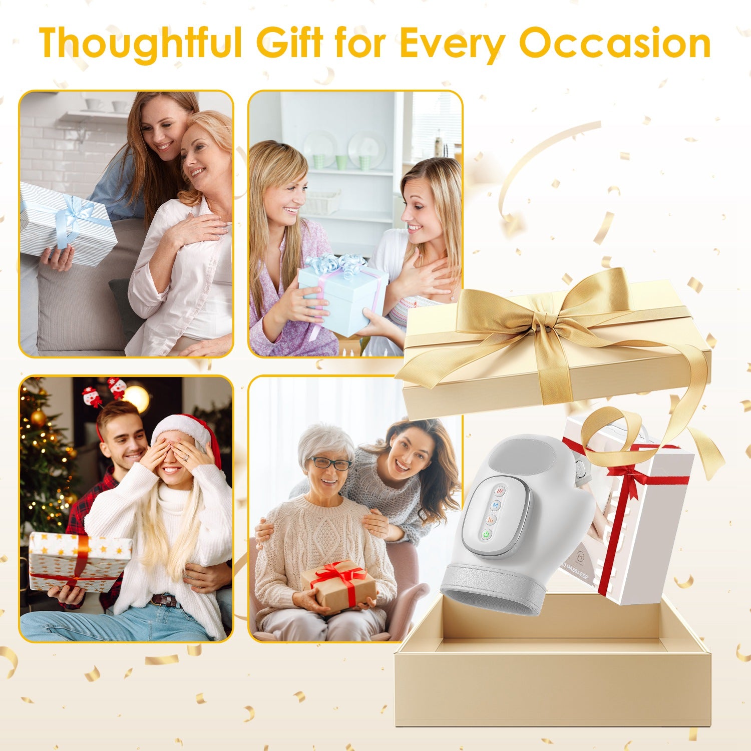 Massageador de mãos sem fio com 14 airbags 3D que cobre dedos, palmas e pulsos. Três modos de massagem, cinco níveis de intensidade e três níveis de aquecimento para aliviar artrite e síndrome do túnel do carpo. Bateria recarregável de 2000mAh oferece até 5 dias de uso contínuo. Acompanha massageador de dedos, luvas descartáveis, bolsa de transporte e cabo USB tipo C. Exterior em couro PU com temporizador automático de 15 minutos.